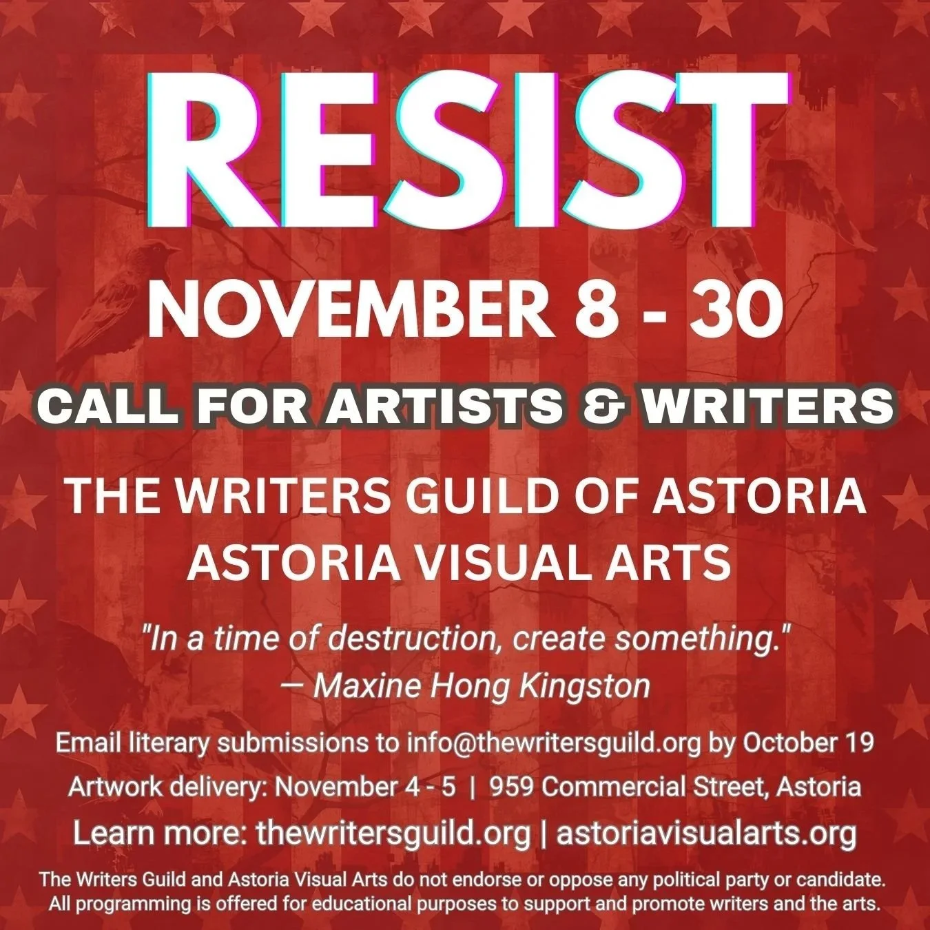In collaboration, Astoria Visual Arts (AVA) and The Writers Guild welcome creative voices to explore the theme “RESIST” during an open-call exhibit at AVA, November 8 - 30.
